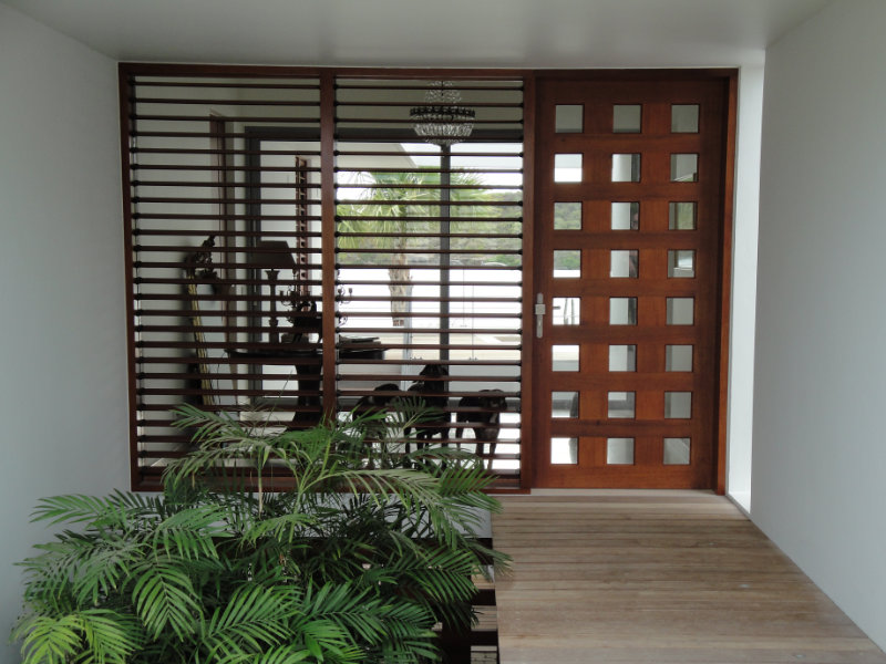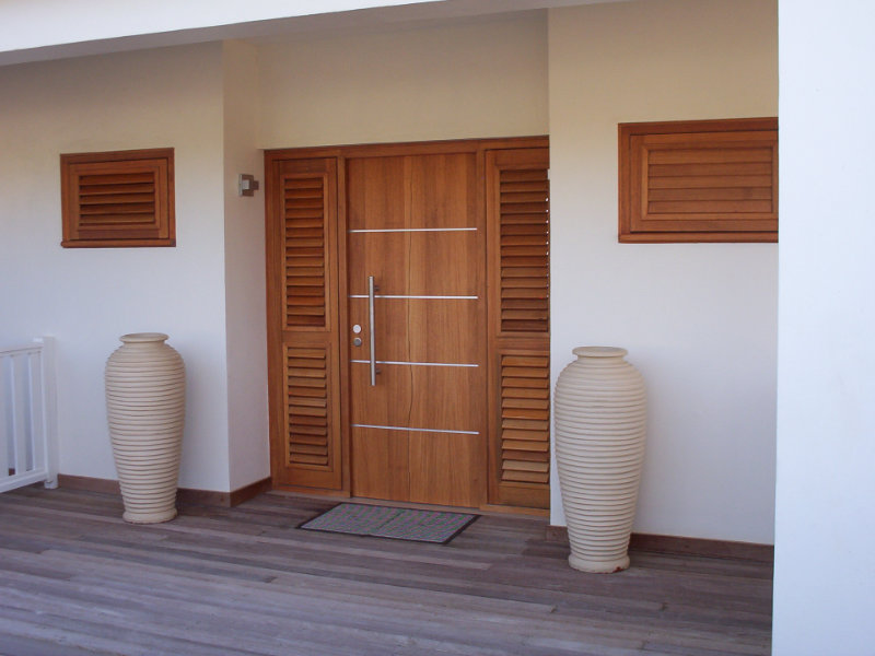 Entrance door with glass mosaic and louver windows